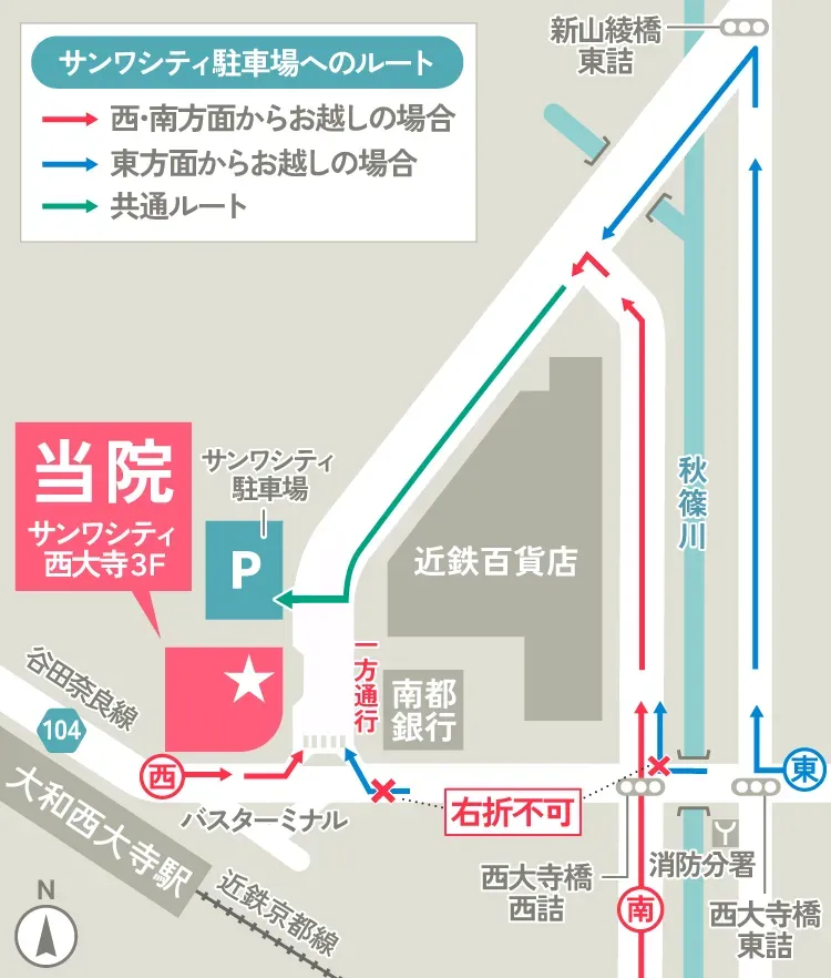 大和西大寺駅から徒歩約1分に位置し、アクセスしやすい立地で幅広い年代の方が通いやすい環境を整えている矯正歯科です。公共交通機関を利用する方はもちろん、お車での来院にも対応できるよう駐車場を完備し、患者様が安心して通えるよう配慮しています。通勤や通学の合間にも立ち寄りやすく、長く通院を続けやすい地域密着型の歯科医院として、快適な治療環境づくりを心がけています。